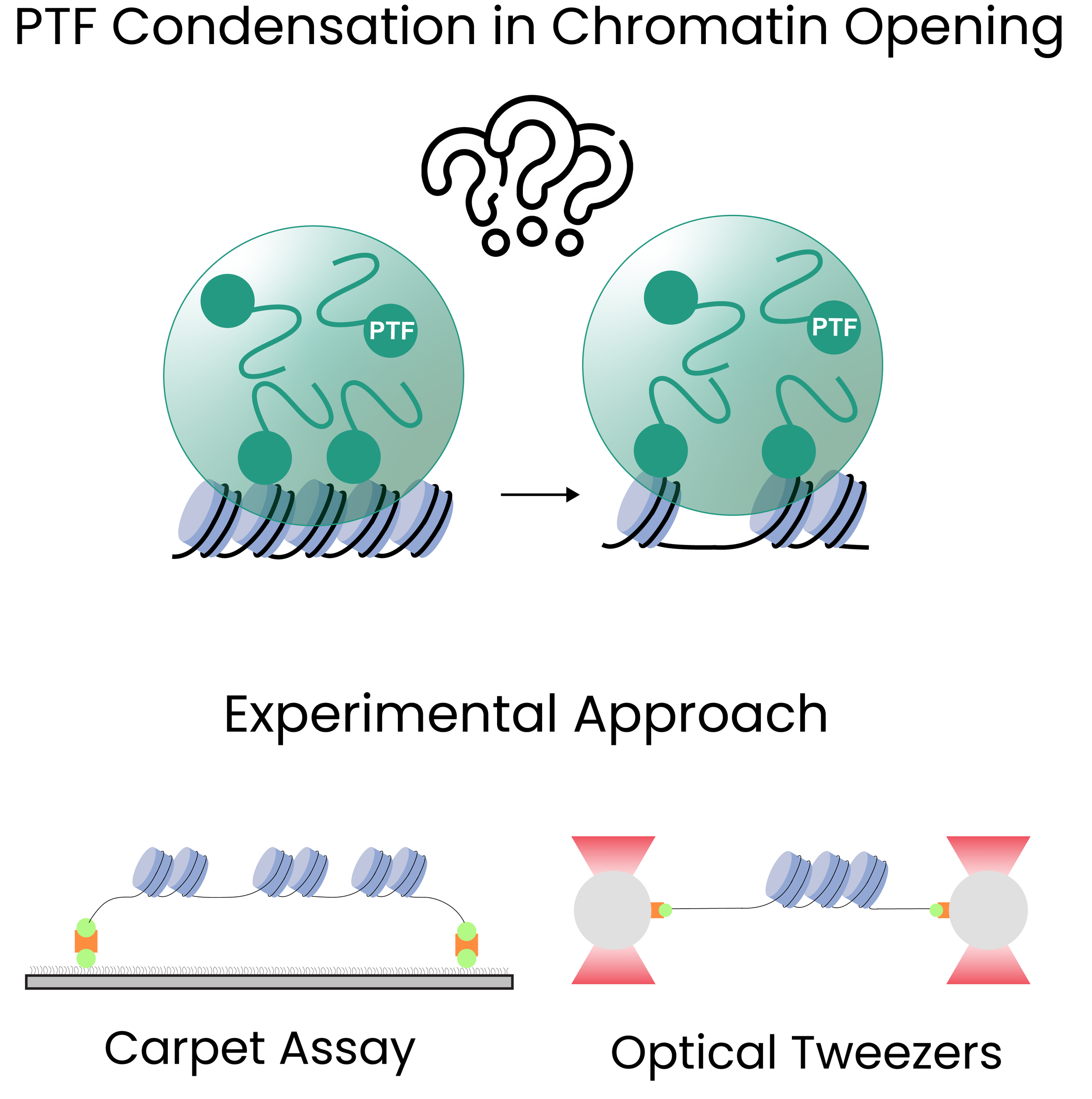 This PhD project explores how pioneer transcription factors (PTFs) use biomolecular condensation to remodel chromatin structure. While PTFs are known to access DNA within compacted chromatin, the role of their condensates in facilitating chromatin opening remains unclear. To address this, chromatin is reconstituted in vitro using fluorescently labeled histones and defined DNA templates, and its interaction with PTFs is studied using single-molecule techniques. These include optical tweezers to detect nucleosome unwrapping through force spectroscopy, and the carpet assay to visualize condensate formation on surface immobilized chromatin via TIRF microscopy. Together, these approaches allow to dissect how PTF condensation influences chromatin accessibility at the single-molecule level.